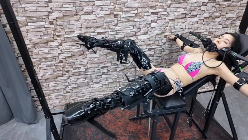 「草莓」「完全拘禁物化」单手套皮衣锁链拘束,油亮黑丝,吊架放置插入强高